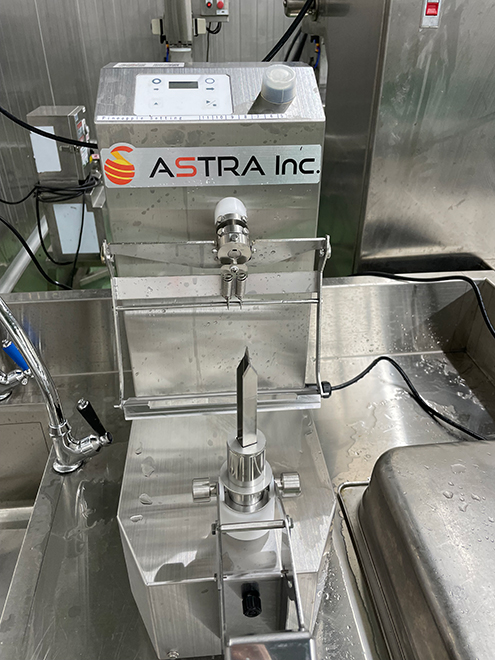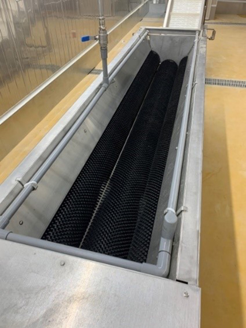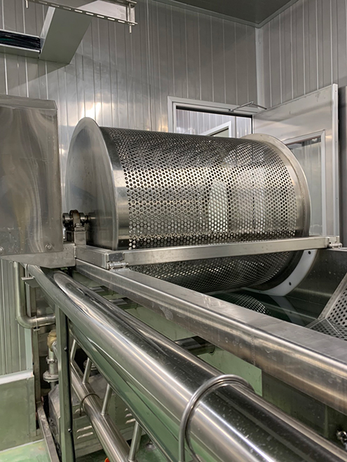 第二槽 - 氣曝洗滌機: 搭載次氯酸水系統可有效抑制微生物,另外設有金屬磁棒可吸附金屬異物。