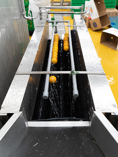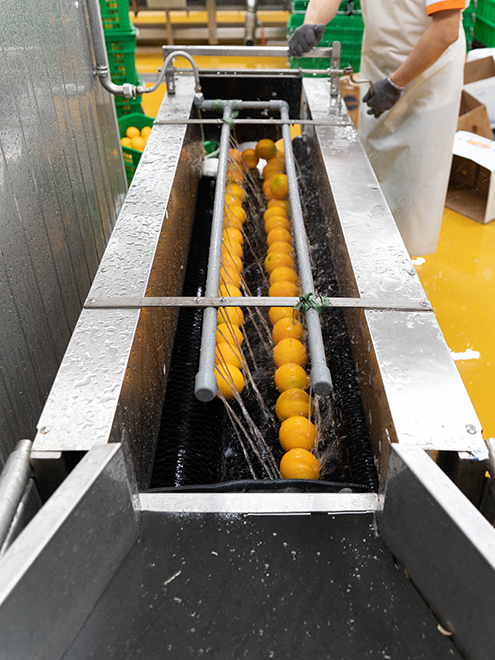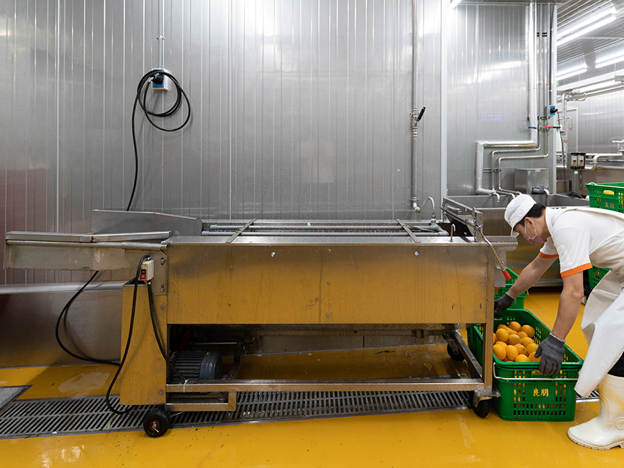 將水果整籃放入清洗機中,以籃裝避免水果在清洗過程中碰撞損傷。